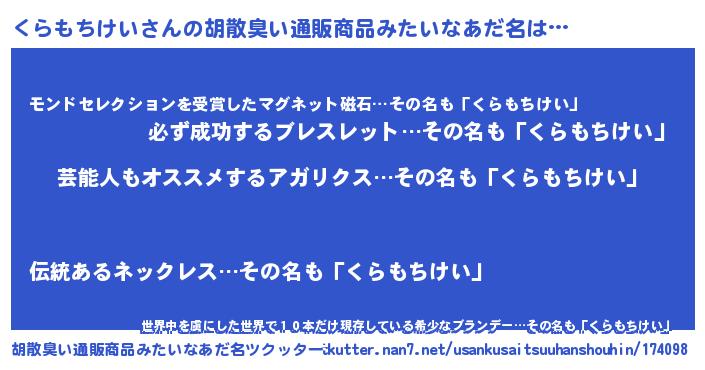 | 男性向けラノベタイトル風あだ名 | 『うちのくらもちけいが世界を掌握している!』 |