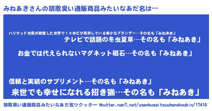 | ヘコむあだ名 | 『みねあき(笑)』『みねぷりん』 |