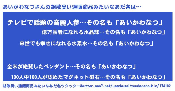 | ヘコむあだ名 | 『あいかわなつ(震え声)』『あいもー』 |