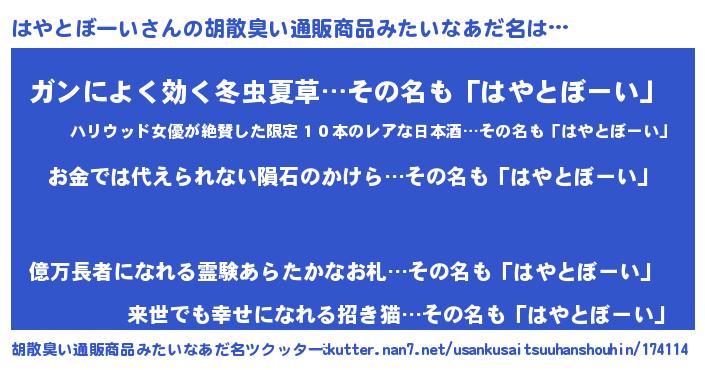 | ヘコむあだ名 | 『はやとぼーい(苦笑)』『はやもー』 |