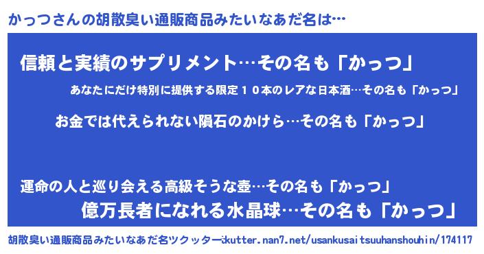 | 男性向けラノベタイトル風あだ名 | 『転生したらかっつだった件』 |