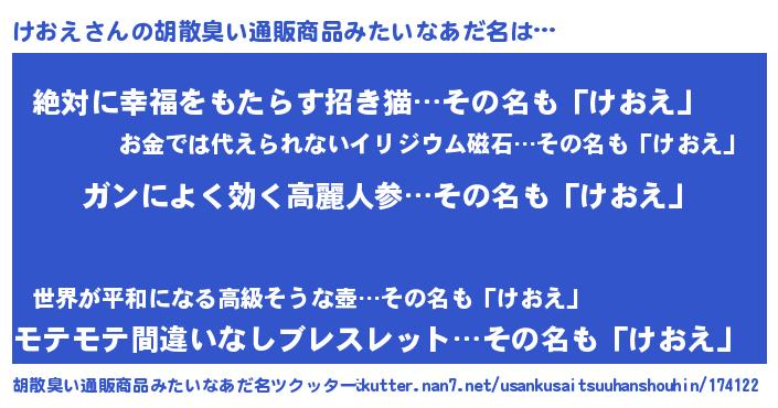 | 意味不明あだ名 | 『自称けおえ』『もやし科けおえ属』 |