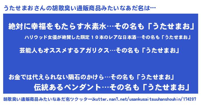| 男性向けラノベタイトル風あだ名 | 『うたせまおに滅ぼされるだけの簡単なお仕事です』 |