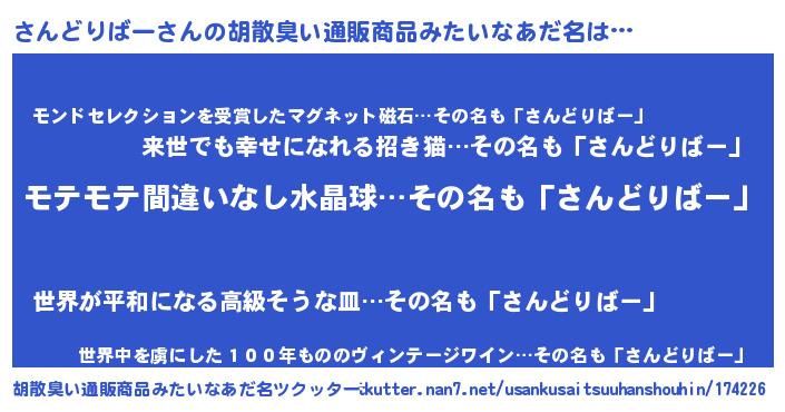 | 男性向けラノベタイトル風あだ名 | 『さんどりばーに滅ぼされるだけの簡単なお仕事です』 |