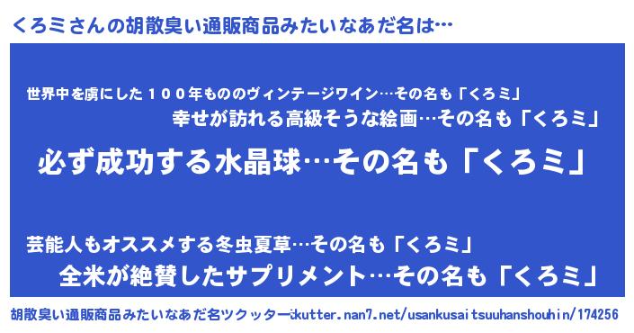 | 男性向けラノベタイトル風あだ名 | 『くろミの憂鬱』『魔弾の王とくろミ』 |