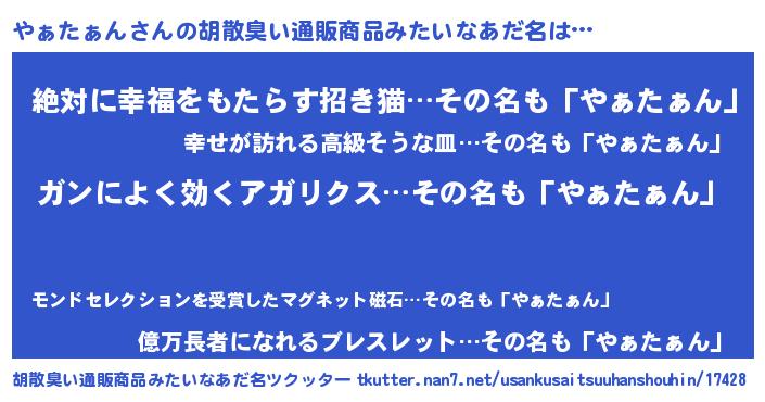 | 意味不明あだ名 | 『自称やぁたぁん』『永久保存やぁたぁん』 |