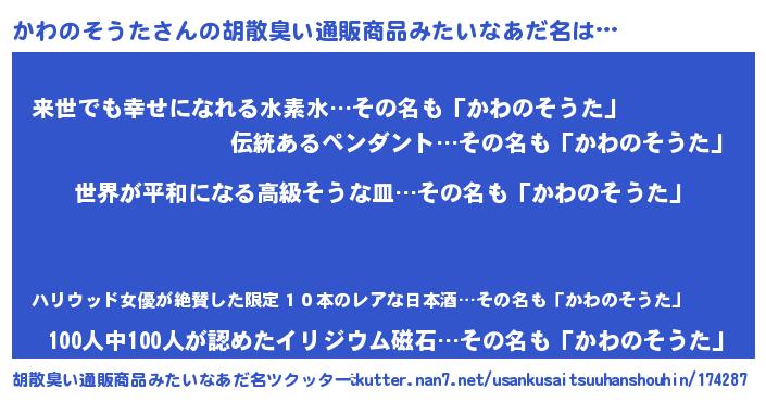 | 男性向けラノベタイトル風あだ名 | 『やはりかわのそうたの青春ラブコメはまちがっている 』 |