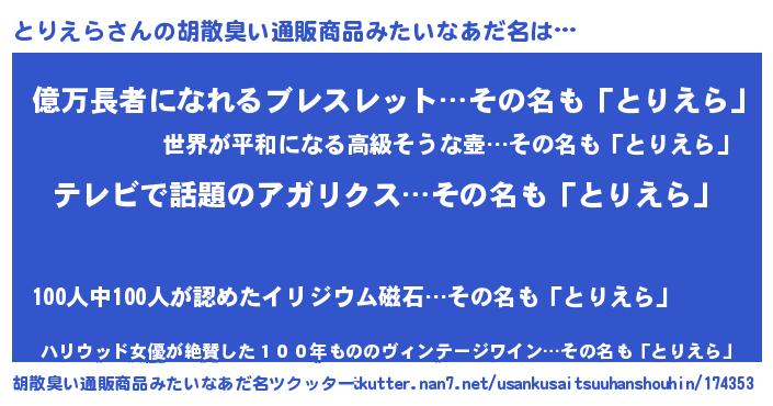 | 男性向けラノベタイトル風あだ名 | 『とりえらに滅ぼされるだけの簡単なお仕事です』 |