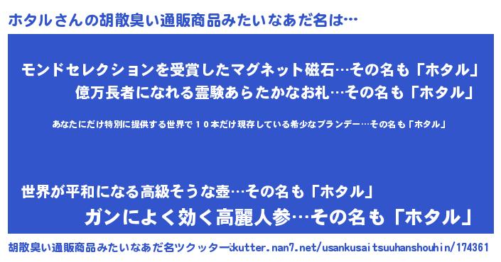 | 意味不明あだ名 | 『住所不定無職ホタル(81歳)』『自称ホタル』 |