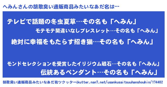 | 意味不明あだ名 | 『永久保存へみん』『自称へみん』 |