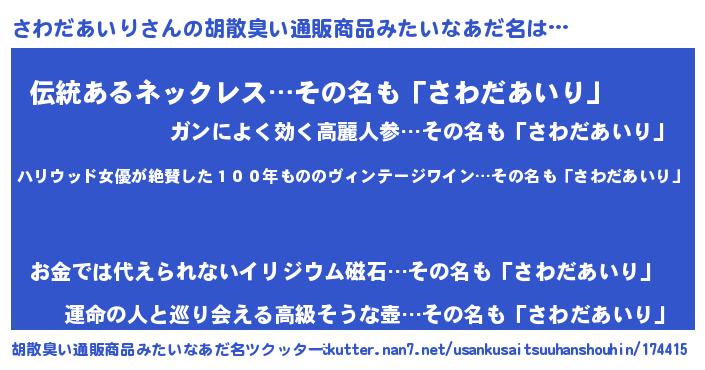 | 意味不明あだ名 | 『住所不定無職さわだあいり(4歳)』 |