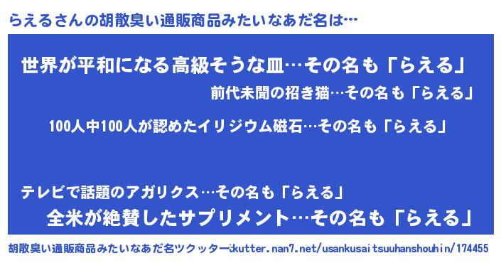 | 意味不明あだ名 | 『眠気覚ましガムらえる味』『自称らえる』 |