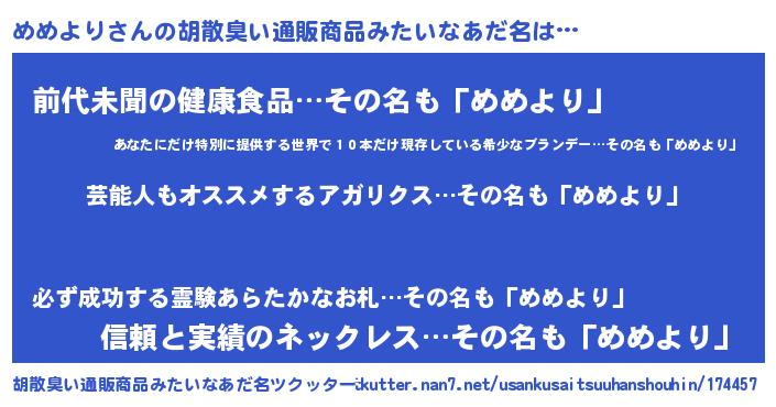 | 男性向けラノベタイトル風あだ名 | 『Re:めめよりから始める異世界生活』 |