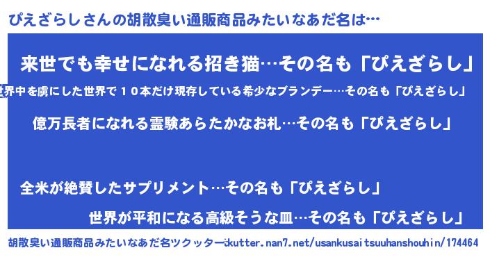 | 男性向けラノベタイトル風あだ名 | 『ぴえざらし~年齢イコール彼女いない歴の魔法使い~』 |