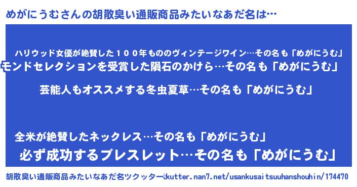 | 意味不明あだ名 | 『自称めがにうむ』『ペロリンめがにうむ』 |