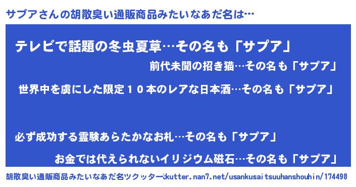 | 意味不明あだ名 | 『住所不定無職サプア(39歳)』『自称サプア』 |