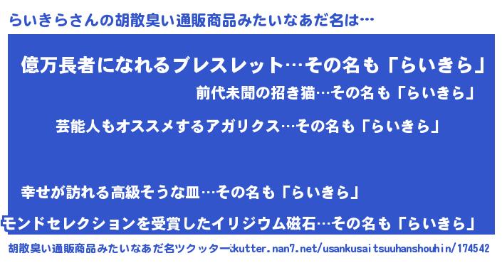 | ヘコむあだ名 | 『らいにゅー』『らいきら(小並感)』 |