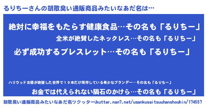 | 男性向けラノベタイトル風あだ名 | 『ルリチースレイヤー』『るりちーの憂鬱』 |