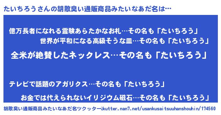 | 男性向けラノベタイトル風あだ名 | 『たいちろうの嫁は女の子じゃないと思った?』 |