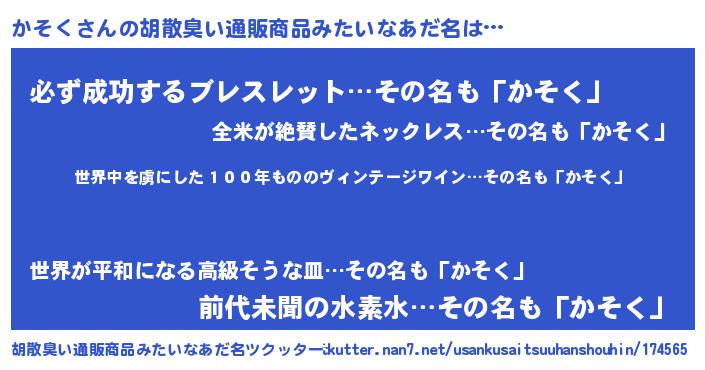 | 意味不明あだ名 | 『住所不定無職かそく(2歳)』 |