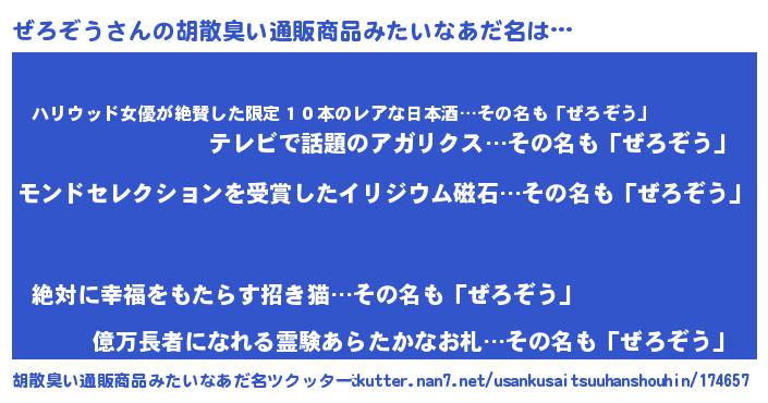 | 男性向けラノベタイトル風あだ名 | 『ぜろぞうに滅ぼされるだけの簡単なお仕事です』 |