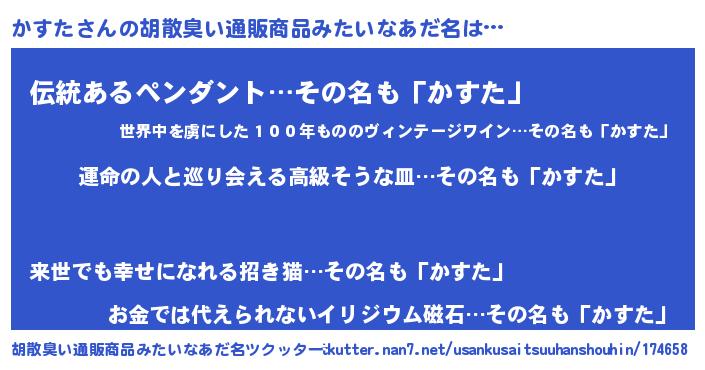 | 男性向けラノベタイトル風あだ名 | 『かすた~年齢イコール彼女いない歴の魔法使い~』 |