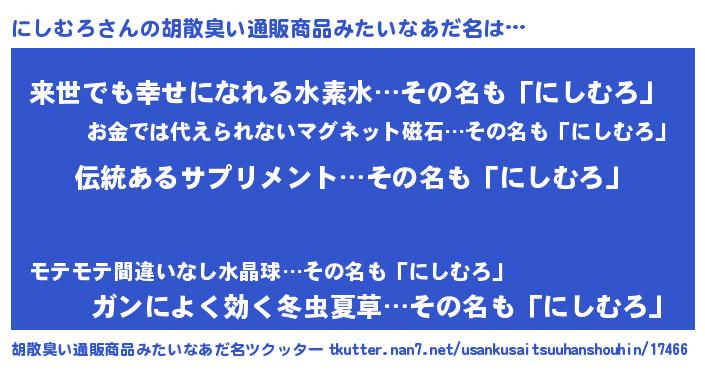 | ヘコむあだ名 | 『にしを』『にしむろ(笑)』『豆乳』 |