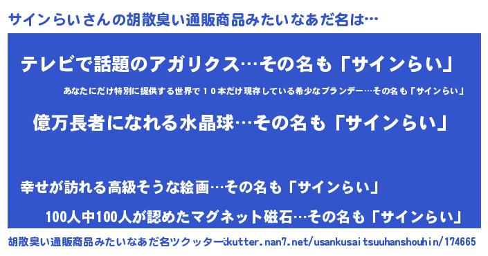 | 意味不明あだ名 | 『ペロリンサインらい』『自称サインらい』 |