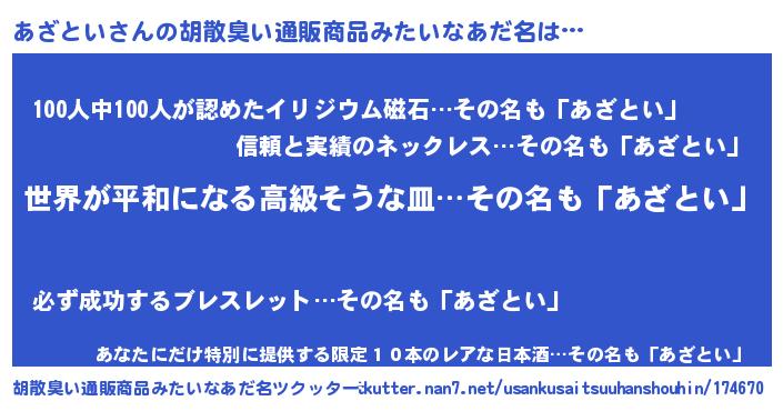 | ヘコむあだ名 | 『なまこ酢』『あざお』『あざにー』 |