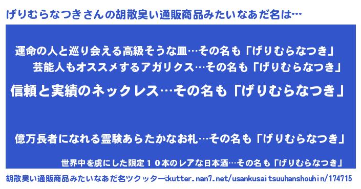 | 女子向けラノベタイトル風あだ名 | 『げりむらなつきは平凡を望む』 |