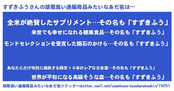 | ヒーロー風カッコイイあだ名 | 『慈愛の使者すずきふう』『炎刃騎士スズ』 |