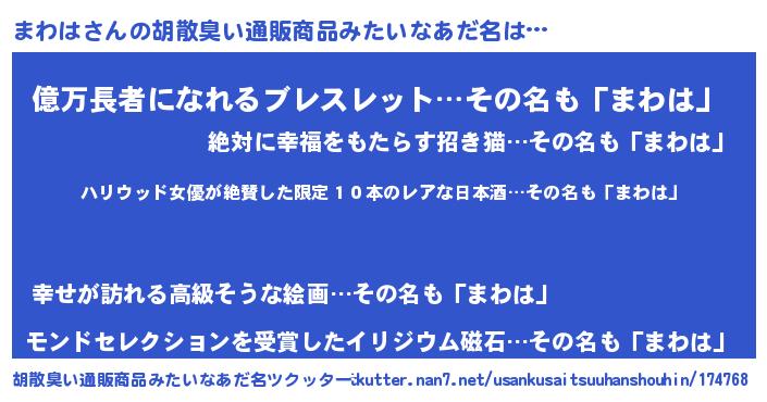 | ヘコむあだ名 | 『まわふぇ~』『まわは(小並感)』 |