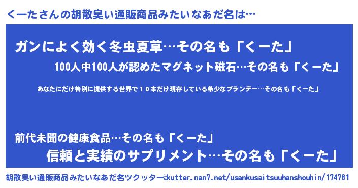 | 意味不明あだ名 | 『ヨモギ科くーた属』『自称くーた』 |