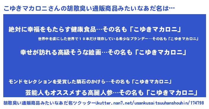 | 女子向けラノベタイトル風あだ名 | 『こゆきマカロニの雑貨屋さん』 |