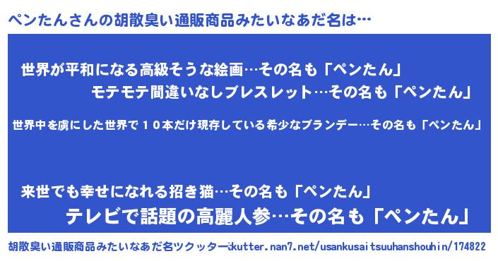 | 意味不明あだ名 | 『住所不定無職ペンたん(74歳)』 |