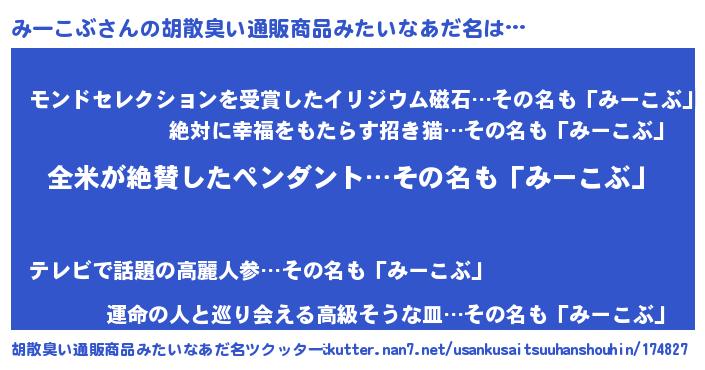 | 男性向けラノベタイトル風あだ名 | 『みーこぶ~年齢イコール彼女いない歴の魔法使い~』 |