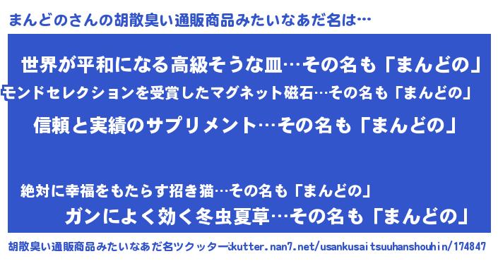 | 意味不明あだ名 | 『とにかく怪しいまんどの』 |