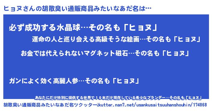 | 男性向けラノベタイトル風あだ名 | 『ノーゲーム・ノーヒョヌ』 |