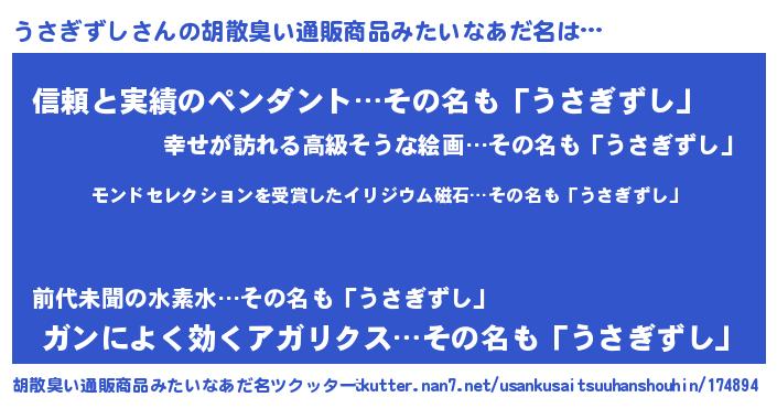 | ヒーロー風カッコイイあだ名 | 『天空の使者うさぎずし』『黄金騎士ウサ』 |