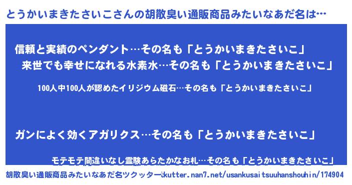 | 欧米人風あだ名 | 『アンジェラ・とうかいまきたさいこ』 |