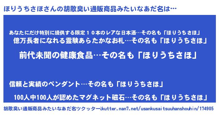 | 男性向けラノベタイトル風あだ名 | 『ほりうちさほ~年齢イコール彼女いない歴の魔法使い~』 |
