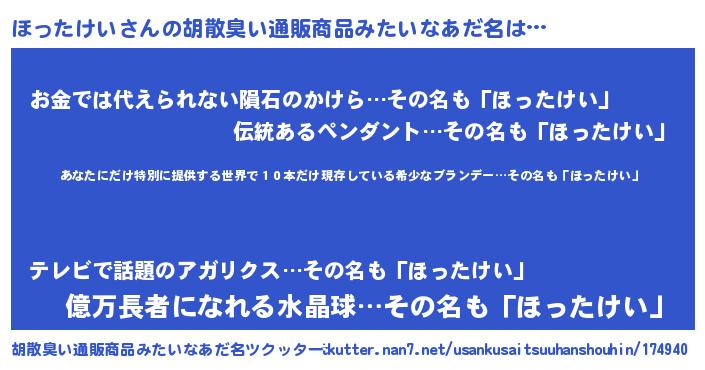 | 男性向けラノベタイトル風あだ名 | 『ほったけい~年齢イコール彼女いない歴の魔法使い~』 |