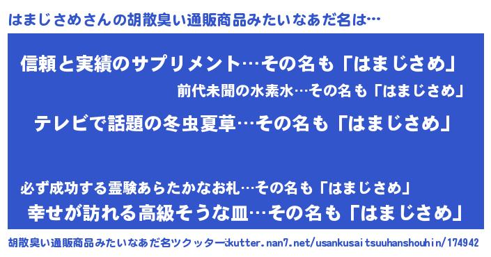 | 男性向けラノベタイトル風あだ名 | 『Re:はまじさめから始める異世界生活』 |
