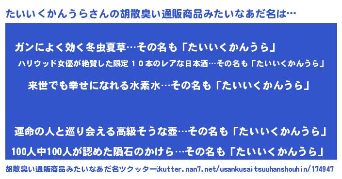 | 男性向けラノベタイトル風あだ名 | 『たいいくかんうらという概念が存在しない退屈な世界 』 |