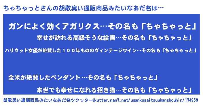| 意味不明あだ名 | 『住所不定無職ちゃちゃっと(12歳)』 |
