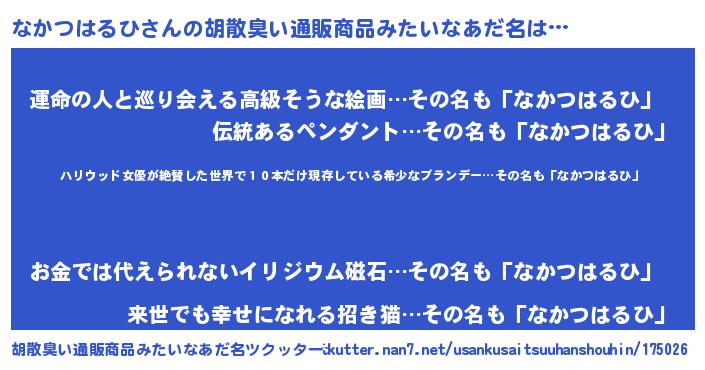 | 意味不明あだ名 | 『住所不定無職なかつはるひ(95歳)』 |