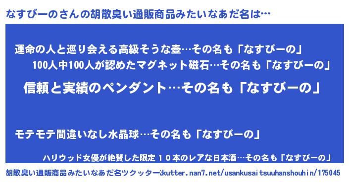 | 男性向けラノベタイトル風あだ名 | 『ダンジョンになすびーのを求めるのは間違っているだろうか』 |