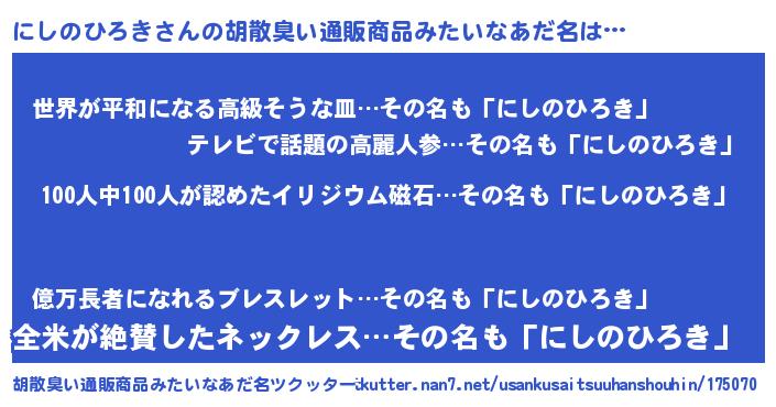 | 欧米人風あだ名 | 『アンジェラ・にしのひろき』 |