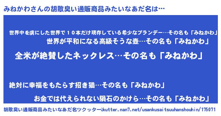 | 意味不明あだ名 | 『とにかく怪しいみねかわ』 |