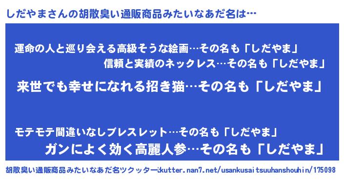 | ヘコむあだ名 | 『しだやま(笑)』『酢こんぶ』 |